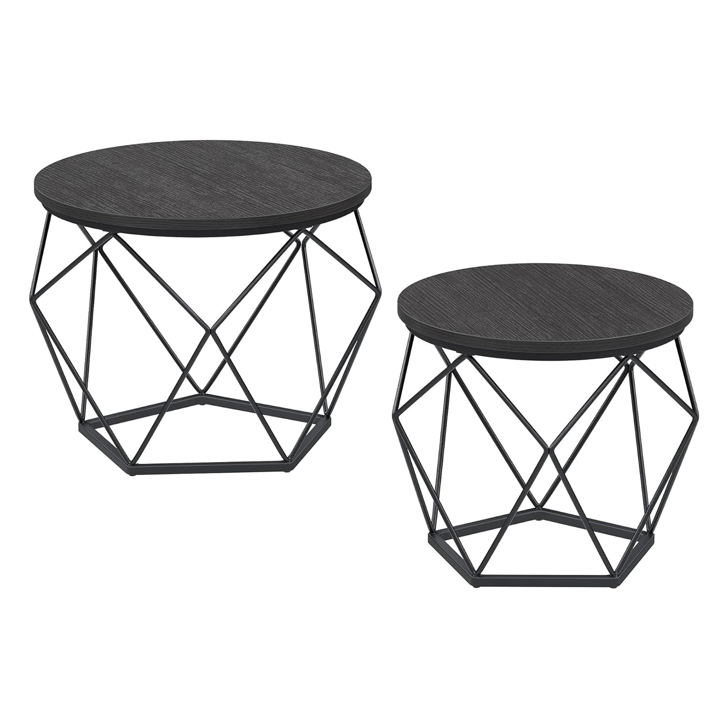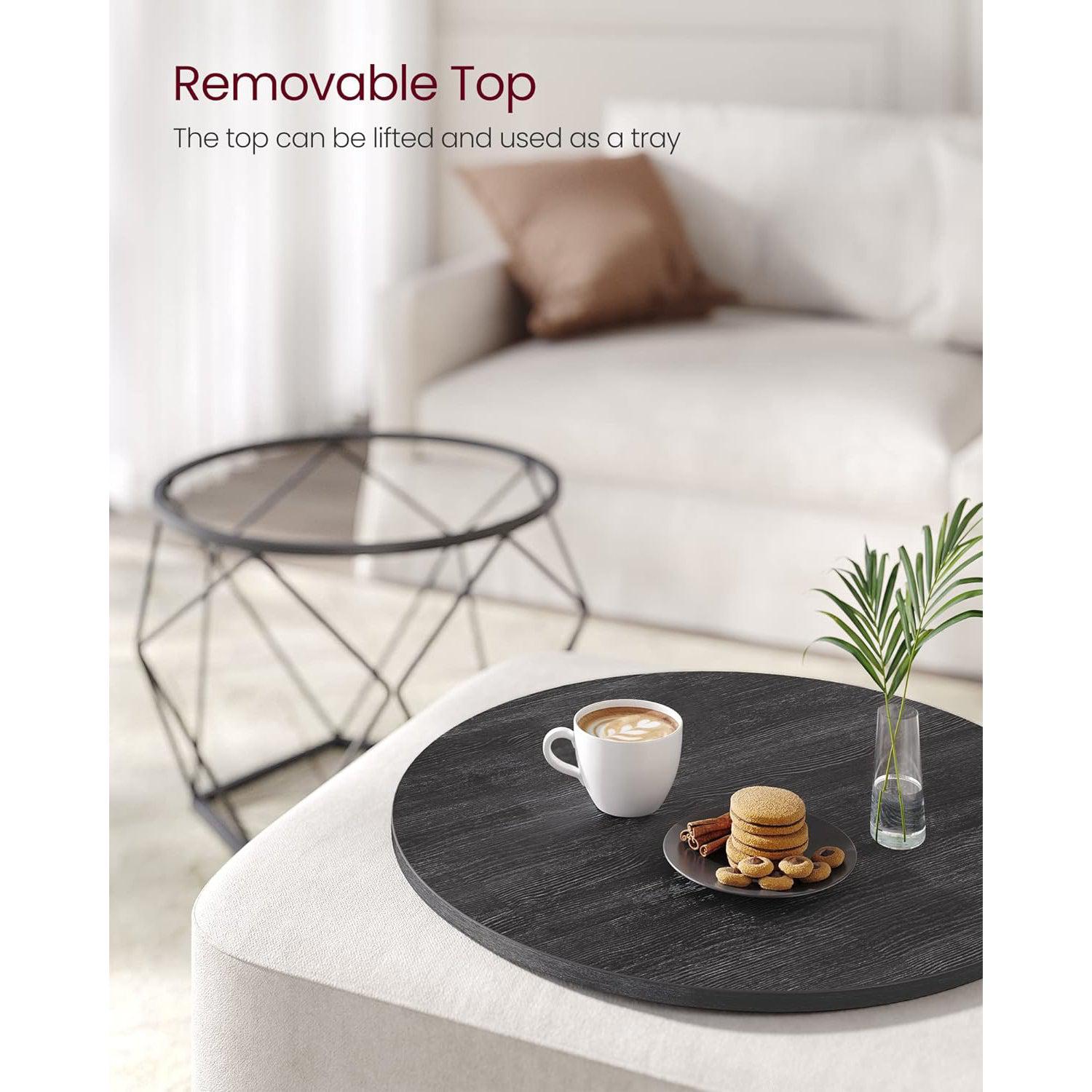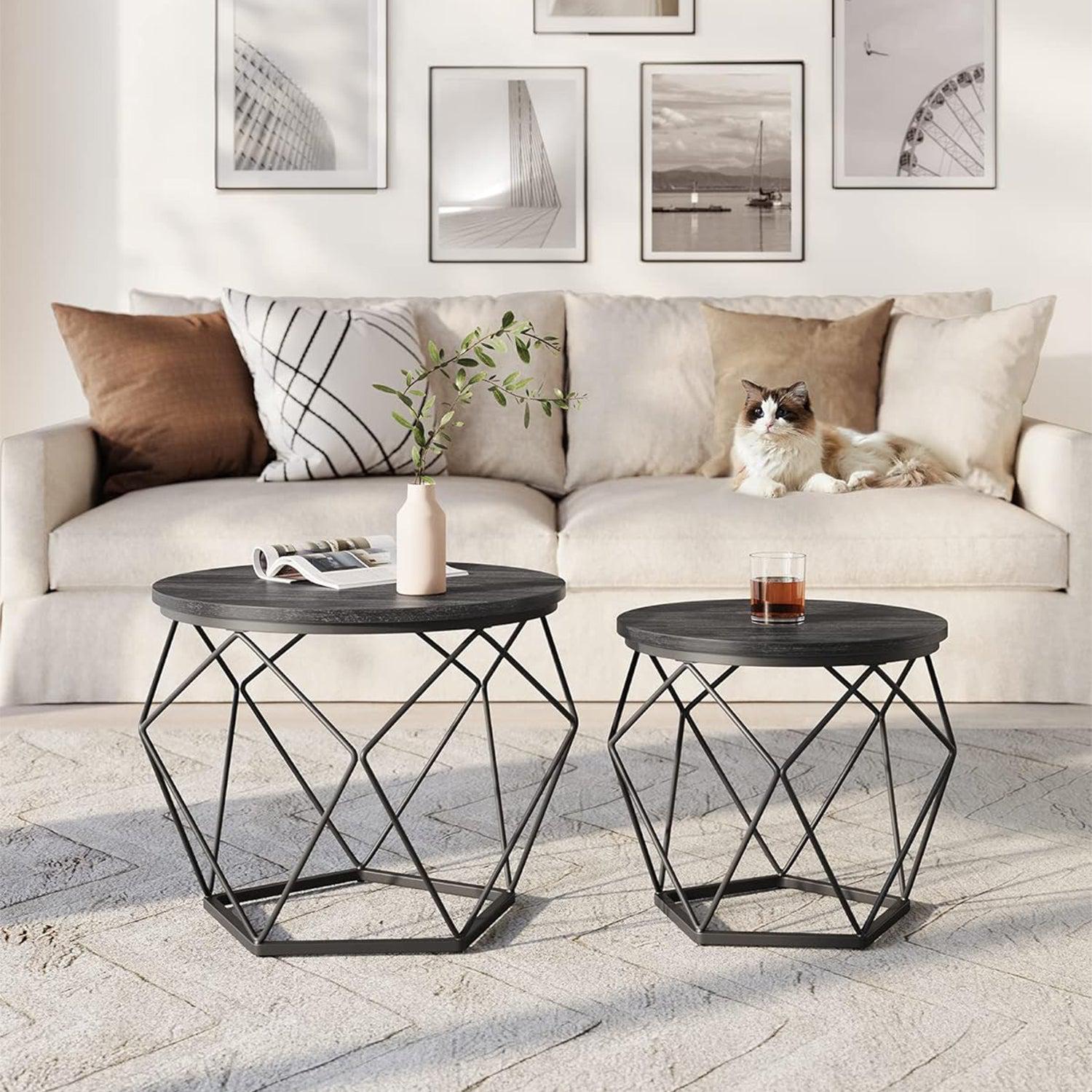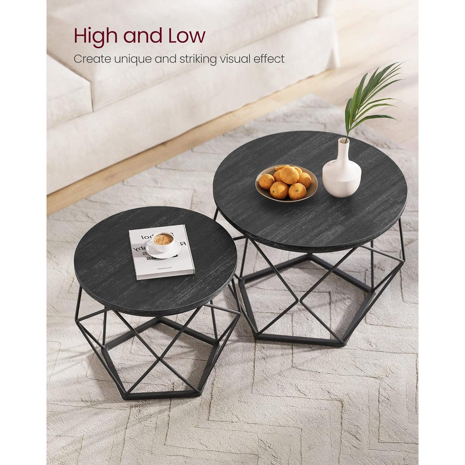 Kerek dohányzóasztalok, 2 db oldalsó asztalkészlet, Modern stílusú, Levehető asztallap, Acélkeret, Nappaliba, Fekete :