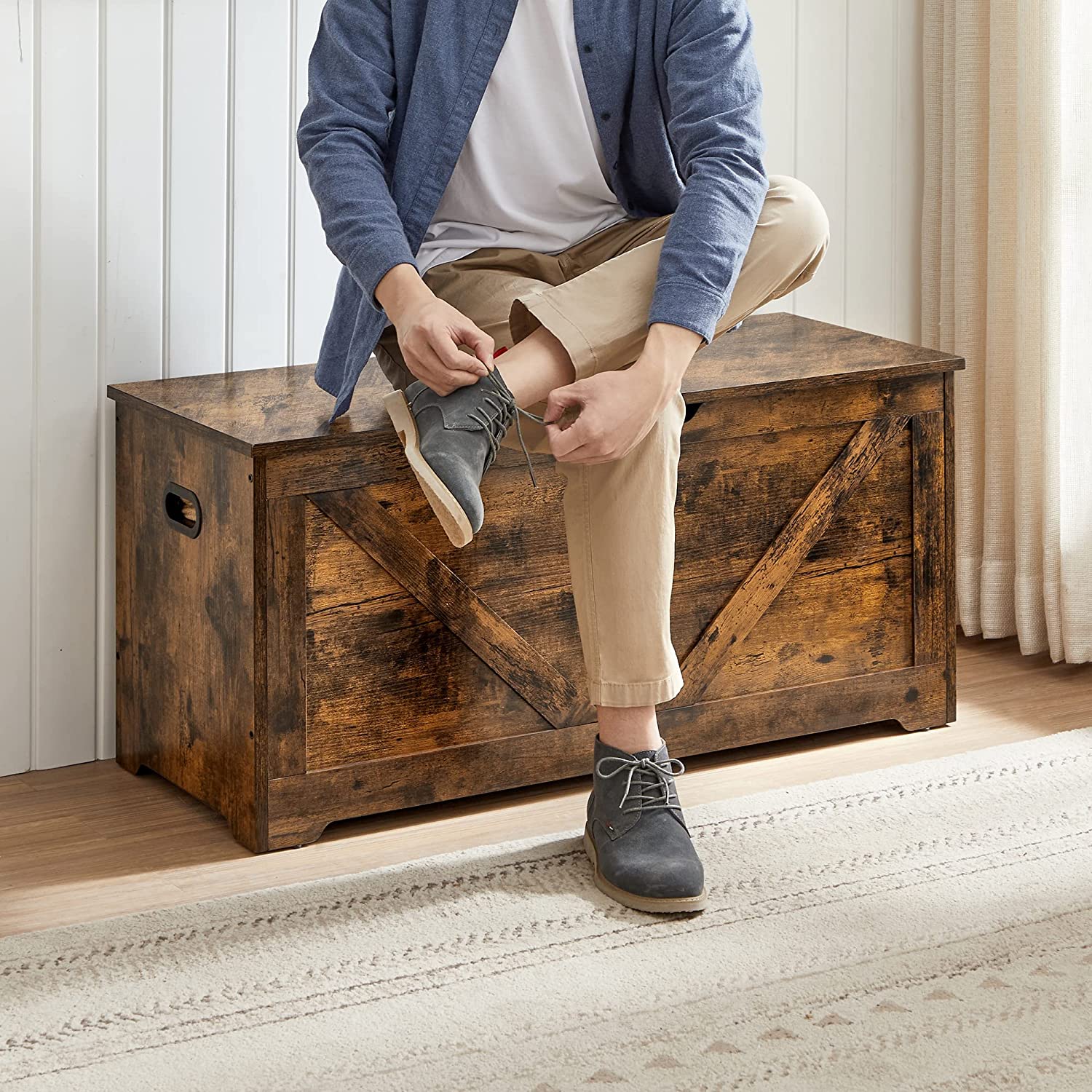 Cipős pad, pad tárolóhellyel, ülőláda, tárolószekrény, játékláda, vidéki stílusú, biztonsági zsanérok, 100 x 40 x 46 cm, vintage barna: